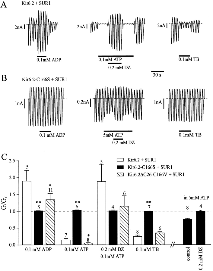 Figure 7. Effect of mutations at residue C166 on the coupling of Kir6.2 to SUR1. (A and B) Macroscopic currents recorded from inside-out patches in response to a series of voltage ramps from −110 to +100 mV. Oocytes were injected with mRNAs encoding Kir6.2 + SUR1 (A) or Kir6.2-C166S + SUR1 (B). MgADP, MgATP, diazoxide (DZ), or tolbutamide (TB) were added to the internal solution as indicated by the bars. (C) Mean macroscopic slope conductance recorded in the presence of the agents indicated (G), expressed as a fraction of the mean (Gc) of that obtained in control solution (no additions) before and after exposure to the test compound(s). The dashed line indicates the current level in the absence of the test compound. Oocytes were injected with mRNAs encoding Kir6.2 + SUR1 (white bars), Kir6.2-C166S + SUR1 (black bars), or Kir6.2ΔC26-C166V + SUR1 (hatched bars). The number of oocytes is given above the bars. *P < 0.05, **P < 0.01 against Kir6.2 + SUR1. Image published in: Trapp S et al. (1998) Image reproduced on Xenbase with permission of the publisher and the copyright holder. Creative Commons Attribution-NonCommercial-ShareAlike license Larger Image Printer Friendly View |