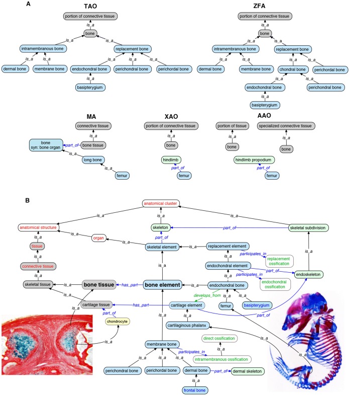 Figure 4. Representation of the skeleton in vertebrate anatomy ontologies.The vertebrate skeleton can be partitioned according to many different criteria – and it had been by the different groups (Table 1) that developed anatomy ontologies. For example (A), ‘bone’ had been treated as a type of tissue by all except the MA, who also related it to the concept of ‘bone organ’. In the VSAO (B), the concepts of bone tissue and bone element were disentangled, named and defined. Individual bone elements were related to their tissue and cell components as well as developmental processes. From these links one can reason that, e.g., the ‘femur’ is part_of ‘endoskeleton’, develops_from ‘cartilage element’, and participates_in the process of ‘endochondral ossification’, whereas the ‘frontal bone’ is part_of ‘dermal skeleton’ and participates_in the process of ‘direct ossification’. Image on left shows chondrocytes embedded in a bone matrix developed from periosteum of fractured chick dermal bone. Image on right shows a late gestational stage mouse embryo stained with alcian blue and alizarin red. CL term is shown in yellow fill, tissue terms in grey fill, skeletal element terms in blue fill, and skeletal subdivision terms in green fill. Parent classes from CARO are in red font, GO terms in green font, TAO terms in blue font, and VSAO terms in black font. Image published in: Dahdul WM et al. (2012) Image reproduced on Xenbase with permission of the publisher and the copyright holder. Creative Commons Attribution license Larger Image Printer Friendly View |