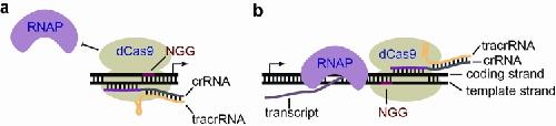 Figure 3. RNA-guided gene repression using engineered CRISPR-Cas systems(a) Mutation of the essential residues of the RuvC and HNH nuclease domains converts Cas9 into a CRISPR RNA (crRNA)-guided DNA-binding protein (dCas9). Directing dCas9 to promoter sequences (either the top or bottom DNA strand) results in prevention of transcription initiation, most likely by preventing the binding of RNA polymerase (RNAP) to the promoter elements. (b) Directing dCas9 to the open reading frame regions of genes (with a crRNA that interacts with the coding but not the template strand) results in a transcription stop, presumably because the dCas9 complex blocks RNAP elongation. Arrows indicate the transcription start site. Abbreviations: cas, CRISPR-associated; CRISPR, clustered regularly interspaced short palindromic repeats; tracrRNA, trans-activating CRISPR RNA. Image published in: Bikard D and Marraffini LA (2013) © 2013 Faculty of 1000 Ltd. Creative Commons Attribution-NonCommercial license Larger Image Printer Friendly View |