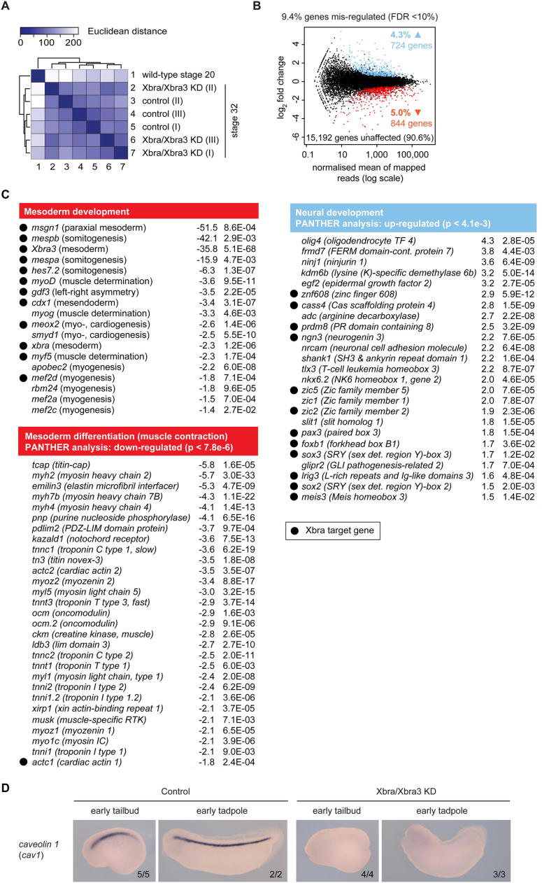 Figure S4. Transcriptome Analysis of Xbra/Xbra3-Depleted Early Tadpoles Confirms Cell Identity Shift from Mesoderm to Neurectoderm, Related to Figure 2(A) Hierarchically clustered heat map of transcriptional profiles (RNA-Seq) of control and Xbra/Xbra3 KD embryos at early tadpole stage (stage 32) in biological triplicates based on Euclidean distances. Wild-type embryos (stage 20) were used as an outlier. We note considerable biological variation among biological replicates (I and III versus II) causing clustering irrespective of KD condition.(B) Plot of averaged read count between the control and KD condition versus the log2 fold change between Xbra/Xbra3 KD and control embryos. Under the condition of 10% FDR, 724 genes were declared as upregulated (4.3%, blue dots), 844 genes as downregulated (5.0%, red dots) and 15,192 genes as not significantly differentially expressed (90.6%).(C) Statistical significance of gene mis-regulation (â¥1.5-fold, FDR < 10%) specific to mesoderm (downregulated; p < 7.8e-6) and neurectoderm (upregulated; p < 4.1e-3) was based on the Mann-Whitney U test using the PANTHER classification system (Mi et al., 2007). Early embryonic tissue-specific data sets were manually curated. Tables list mis-regulated genes (including fold changes and p-values adjusted with the Benjamini-Hochberg procedure) mainly associated with the biological process of mesoderm development (gene abbreviations are followed by the gene-associated mesodermal process in parentheses), muscle contraction (PANTHER GO term) and neural development (PANTHER GO term). A minus preceding the floating-point number of the fold change indicates a downregulation. Genes marked with a dot were associated with Xbra binding.(D) WMISH for caveolin-1 (cav1) at early tailbud and early tadpole stage illustrates the loss of notochord development upon Xbra/Xbra3 KD. Statistics in bottom right corner indicates the number of embryos observed with the depicted WMISH pattern versus the number of embryos analyzed in total. Image published in: Gentsch GE et al. (2013) © 2013 The Authors. Creative Commons Attribution license Larger Image Printer Friendly View |