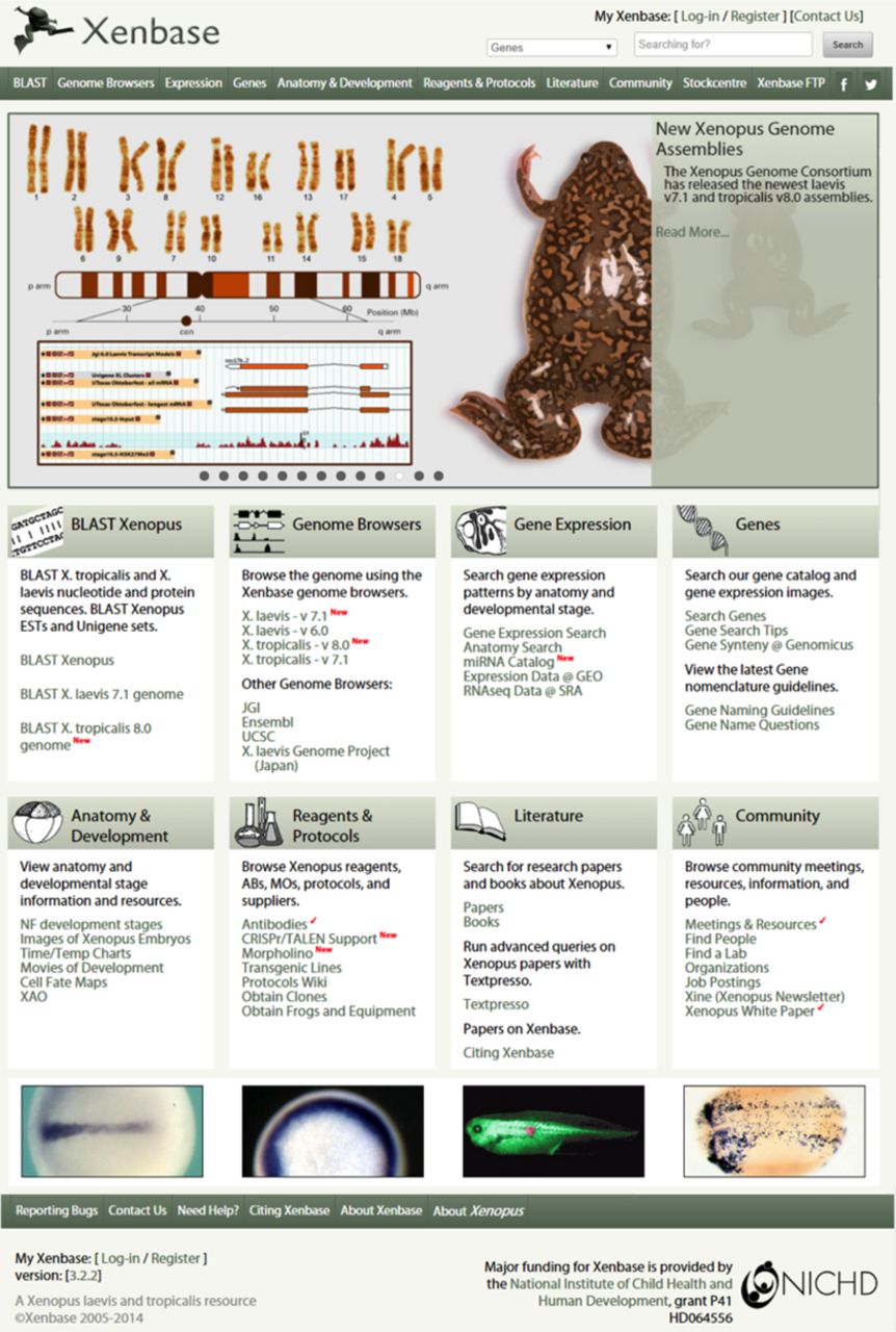 The new Xenbase landing page. The large graphic depicting the Xenopus genomes is dynamic, and displays around 10 recent news stories or papers at any one time. Different Xenbase content is organized into tiles, making up the majority of the page. Across the top of the page are login tools, a search tool and a uniform navigation menu found on every Xenbase page. Down the right-hand side are links to many internal and external resources. Image published in: Karpinka JB et al. (2015) © The Author(s) 2014. Creative Commons Attribution license Larger Image Printer Friendly View |