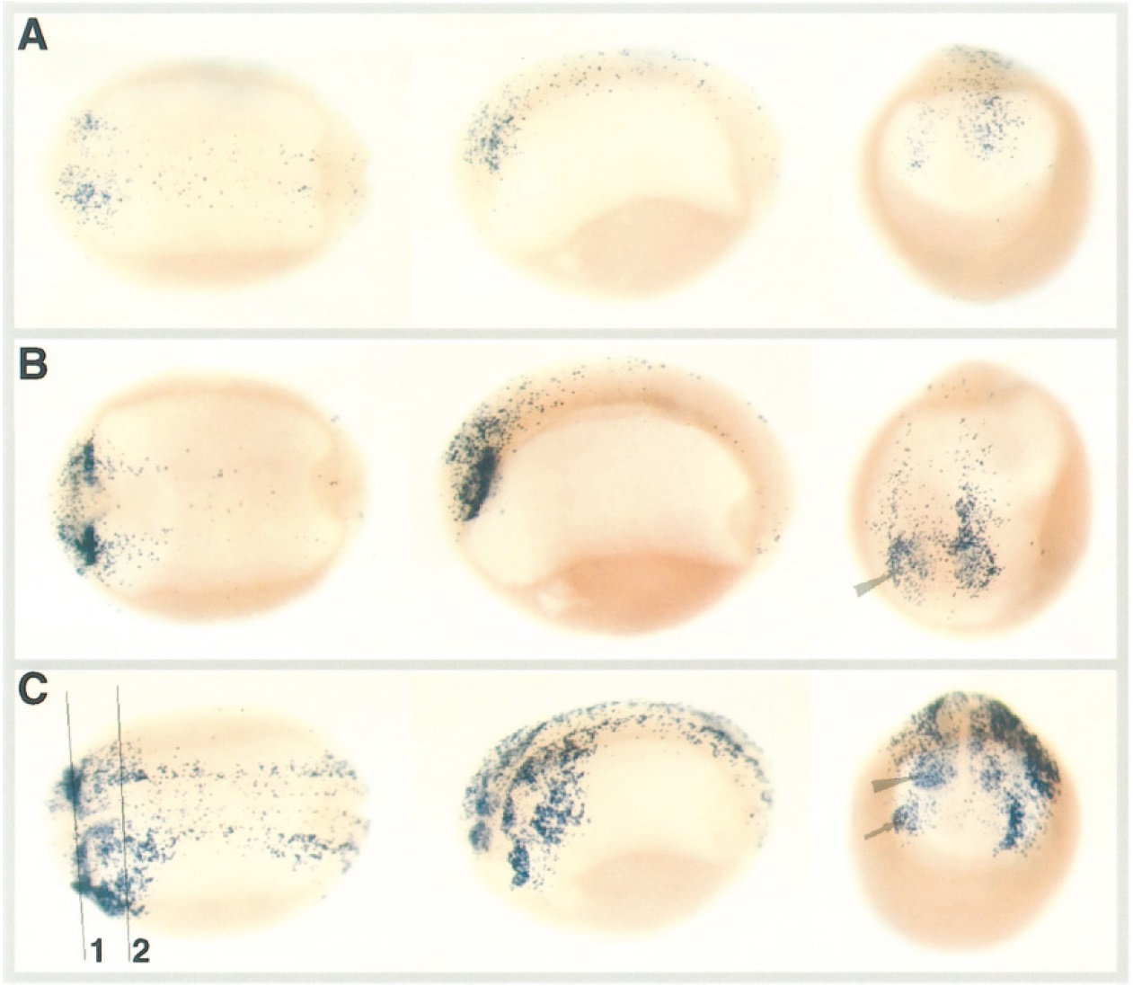 embryo, corresponding to the optic placodes (arrowhead). Staining extends from these placodes along the neural fold. (C) Strongest staining