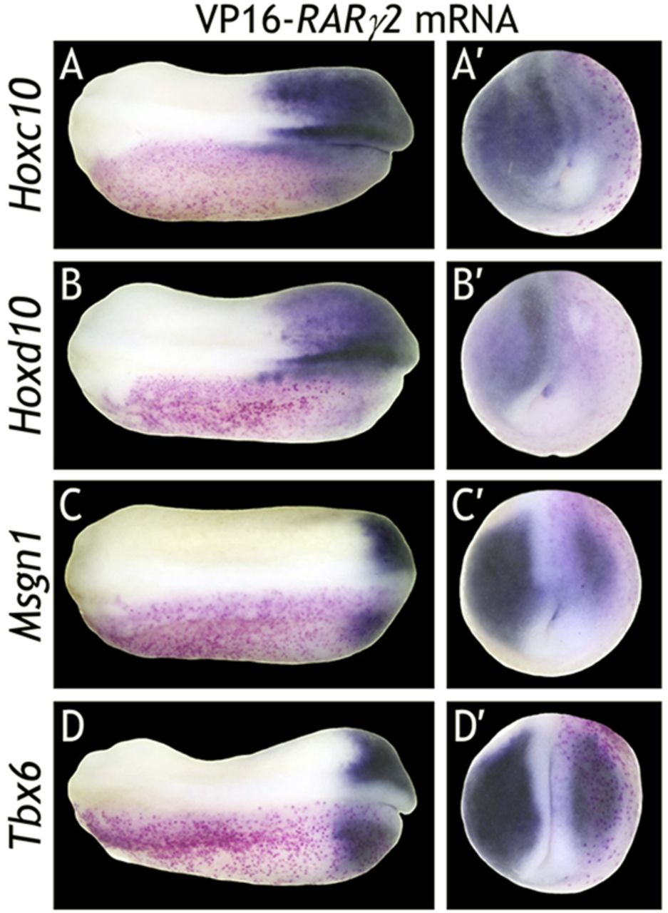 ng VP16-Rarγ2 mRNA or control (mCherry) mRNA. Injected side is indicated by magenta β-gal lineage tracer. Control expression of Hoxc10, Hoxd10, Msgn1 and Tbx6 is shown in Fig. 6A,C,G,I. (A-D) VP16-Rarγ2 overexpression shortens the axis on injected side in 100% of embryos. (A,B) VP16-Rarγ2 mRNA results in neural/midline rostral shift and lateral knockdown in Hoxc10 (9/13 embryos) and Hoxd10 (7/13) expression. Neural/midline knockdown is also observed (Hoxc10, 4/13; Hoxd10, 7/13). (C,D) VP16-Rarγ2 mRNA rostrally shifts and/or knocks down Msgn1 (12/12) and Tbx6 (13/13) expression. Tailbud embryos shown with anterior to left. (Aâ²-Dâ²) Caudal views of A-D. Image published in: Janesick A et al. (2014) Copyright © 2014. Image reproduced with permission of the Publisher and the copyright holder. This is an Open Access article distributed under the terms of the Creative Commons Attribution License. Larger Image Printer Friendly View |