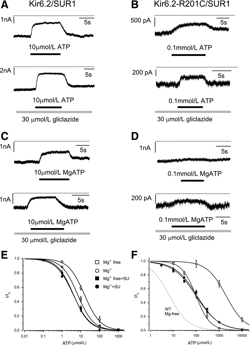 FIG. 2. Effect of gliclazide on ATP block of wild-type and R201C KATP channels. A–D: Representative Kir6.2/SUR1 (A and C) and Kir6.2-R201C/SUR1 (B and D) currents recorded at −60 mV in the absence (A and B) and presence (C and D) of Mg2+. Gliclazide and ATP were added as indicated by the bars. The dotted line indicates the zero current level. E and F: ATP concentration-inhibition curves for Kir6.2/SUR1 (E) and Kir6.2-R201C/SUR1 (F) channels measured in the absence of both gliclazide (SU) and Mg2+ (□) and in the absence of gliclazide but in the presence of 2 mmol/L Mg2+ (○), 30 μmol/L gliclazide without Mg2+ (■), and 30 μmol/L gliclazide plus 2 mmol/L Mg2+ (●). The lines are the best fit of Eq. 1 to the mean data with the following parameters: Kir6.2/SUR1 (E) IC50 = 6.8 μmol/L, h = 1.0 (□); IC50 = 4 μmol/L, h = 1.0 (■); IC50 = 16 μmol/L, h = 1.0 (○); and IC50 = 4 μmol/L, h = 0.97 (●) and Kir6.2-R201C/SUR1 (F): IC50 = 98 μmol/L, h = 1.4 (□); IC50 = 2.0 mmol/L, h = 1.1 (○); IC50 = 97 μmol/L, h = 0.87 (■); and IC50 = 107 μmol/L, h = 0.90 (●). The dotted line is the concentration-inhibition curve for Kir6.2/SUR1 channels in the absence of Mg2+ and gliclazide (Fig. 2E) (□). SU, sulfonylurea; WT, wild-type. Image published in: Proks P et al. (2013) © 2013 by the American Diabetes Association. Creative Commons Attribution-NonCommercial-NoDerivatives license Larger Image Printer Friendly View |