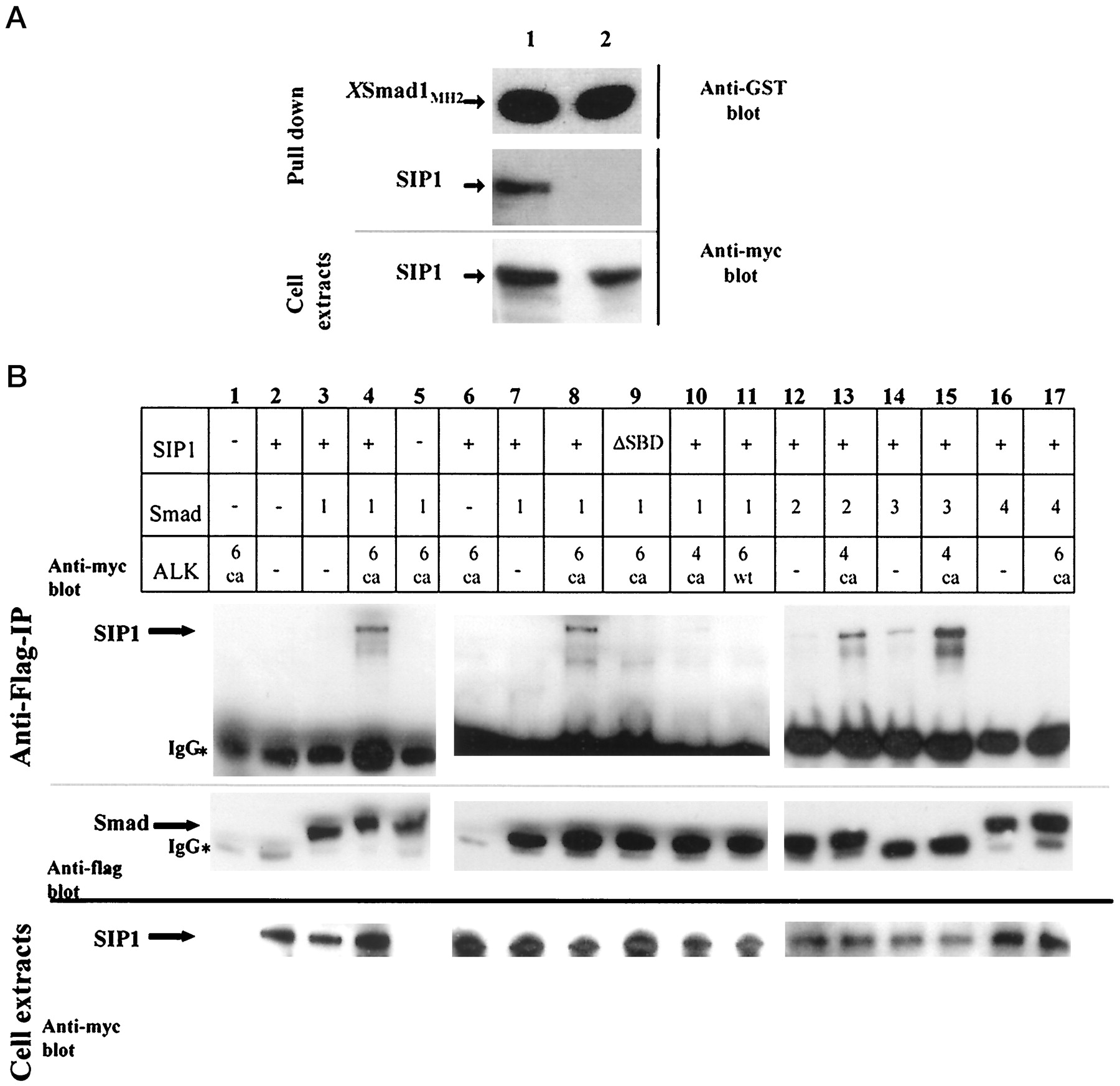 |   | FIG. 5. A, interaction of SIP1 with the MH2 domain of XSmad1 in mammalian cells. An expression construct encoding a fusion between GST and