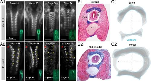 Figure 2. Structural deformations of individual vertebrae after UL. A, Top view of calcein-stained cartilaginous/bony elements of the vertebral column at subsequent stages of premetamorphic and postmetamorphic development in controls (A1) and after UL (A2, Post-UL) at different postlesional intervals (15â47 d); insets show the respective developmental stages; yellow arrowheads and red asterisks indicate deformations of the vertebral column and side of the UL, respectively. B, Cross-section (10 μm) through the rostral tail region at the level of myotome 4 in a stage 57 control tadpole (B1) and 20 d post-UL (B2); specific colorimetric staining of cartilage with Alcian blue and other tissue with hematoxilin-eosin differentiated vertebral elements such as cartilage (car), muscle (mus), spinal cord (sc), and the chorda dorsalis (cho). C, Stacked schematic outlines of cross-sectioned cartilaginous vertebral tissue at the level of myotome 4 (blue lines) of a control (C1) and 20 d post-UL (C2); data are from the material shown in B1 and B2, respectively, and represent a superimposed overlay of 10 successive 10 μm thick sections centered on the spinal cord. Image published in: Lambert FM et al. (2013) Copyright © 2013. OA ARTICLE, images redisplayed under a Creative Commons license. Larger Image Printer Friendly View |