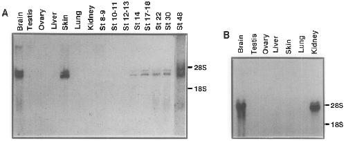 pg/lane) from the indicated adult tissues and Xenopus embryos were hybridized to 9 nick-translated, gel-purified inserts of XLPOU 1 or