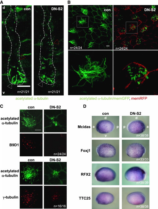 sample. The scale bar represents 10 mm. (C) g-tubulin, but not B9D1, was detected in DN-S2-injected MCC cilia. DN-S2 RNA (4 ng) with memGFP RNA or memGFP RNA alone was injected into the left or right side, respectively. Images from the left (DN-S2) or right (con) lateral side were taken. Scale bar represents 10 mm. (D) Mcidas, Foxj1, RFX2, and TTC25 expression in DN-S2-injected embryos at stage 17 by wholemount