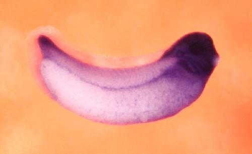 etv3 (ETS variant transcription factor 3) gene expression in Xenopus laevis embryo, assayed via in situ hybridization, NF stage 31, lateral view, anterior right, dorsal up. Copyright © Patient Lab Image created by: Aldo Ciau-Uitz