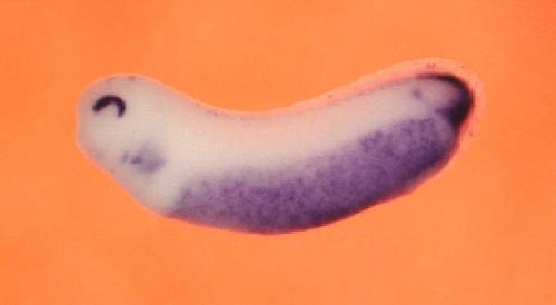 ventx2.2 (VENT homeobox 2, gene 2) gene expression in Xenopus laevis embryo, assayed via in situ hybridization, NF stage 29 and 30, lateral view, anterior left. Copyright © Patient Lab Image created by: Aldo Ciau-Uitz
