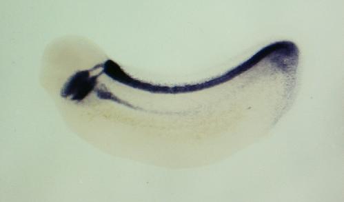 hoxd4 (homeobox D4) gene expression in Xenopus laevis embryo, assayed via in situ hybridization, NF stage 29 & 30, lateral view, anterior left, dorsal up. Copyright © Patient Lab Image created by: Aldo Ciau-Uitz