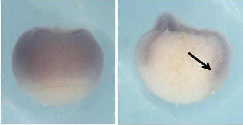 snx27 (sorting nexin family member 27) gene expression in X. laevis embryo, NF stage 10.5, lateral view (image on left) and in bisected embryo (midsagittal section). This image is extracted from figure published in: Belotti E et al. (2013), Image published in: Belotti E et al. (2013) Image downloaded from an Open Access article in PubMed Central. © 2013 by The American Society for Biochemistry and Molecular Biology, Inc.