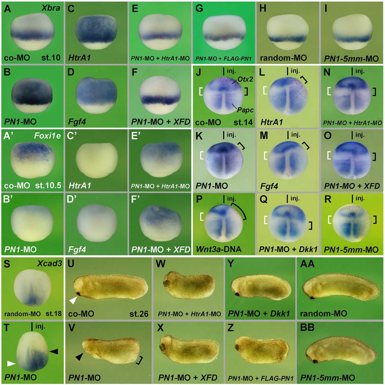 ng HtrA1-MO and XFD mRNA restore normal expression of Xbra and Foxi1e. (G-I) Random-MO, PN1-5mm-MO, and a combination of PN1-MO and non-targeted FLAG-PN1 mRNA do not affect Xbra expression. (J-T) Dorsal view of neurulae. A single injection of PN1-MO shifts the border between Otx2 and Papc (brackets in K) and expands Xcad3 expression (arrowheads in T) anteriorward. Co-MO and PN1-5mm-MO have no effect on Otx2 and Papc (J,R), and random-MO has no effect on Xcad3 expression (S). HtrA1 mRNA, Fgf4 mRNA and Wnt3a-DNA reduce Otx2, but only HtrA1 and Fgf4 expand Papc expression (L,M,P). Co-injections of 5â