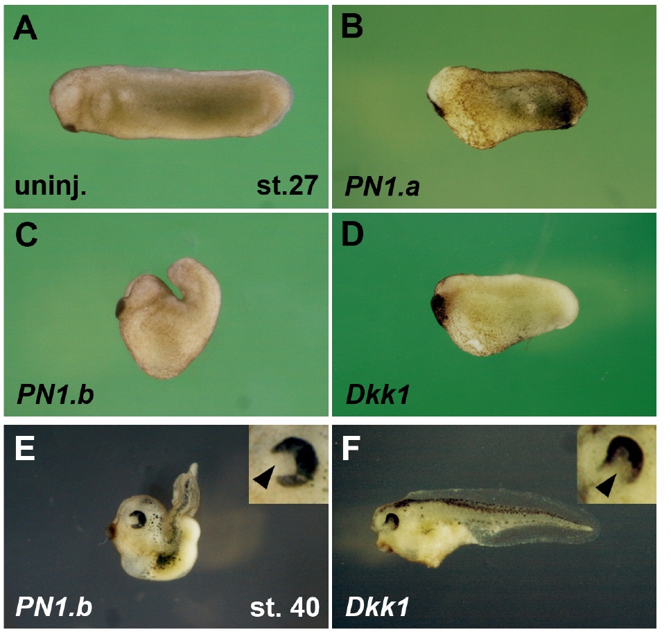 (B-D) PN1.a, PN1.b, and Dkk1 mRNA induce enlarged head and shortened trunk/tail