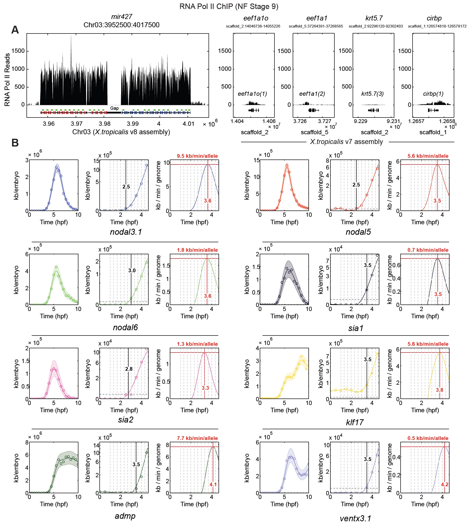 (A) Stage 9 RNA pol II ChIP - Pile ups on mir427, eef1a1o, eef1a1, krt5.7 and cirbp loci of RNA pol II ChIP-seq reads (van
