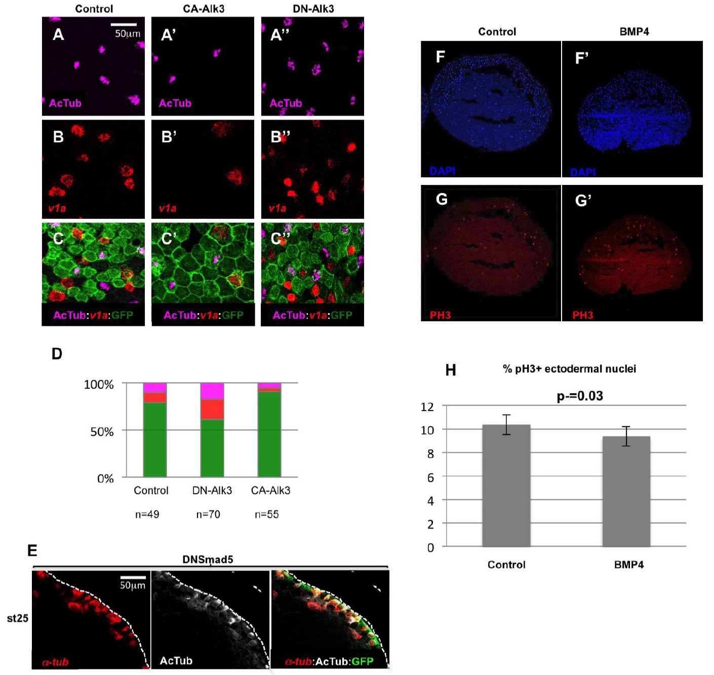 ionocytes. Inhibition of the BMP pathway by DN-Alk3 injection results in an increase in the numbers of MCCs and ionocytes. (D): quantification of the different cellular populations in injected epidermal clones. The bars represent the total number of GFP positive cells scored. Magenta: acetylated tubulin positive MCCs; red: v1a positive ionocytes; green: GFP positive cells negative for both acetylated tubulin and v1a. (E): Embryos injected with a synthetic mRNA coding for a dominant negative form of the zebrafish BMP pathway nuclear effector Smad5 (dnSmad5), showed supernumerary ï¡-tubulin positive MCC precursors, which only partially managed to intercalate. (F-H): Embryos were injected in the blastocoele with BSA (control) or recombinant BMP4 protein (BMP4), fixed at stage 10, cryosectioned and immunostained with an antibody against phosphorylated histone H3 (red), a hallmark of cells in mitosis. DAPI (blue) was used to stain the nuclei. The graph in (H) shows the ratio of phospho-H3 positive nuclei to the total number of ectodermal DAPI stained nuclei. BMP4 injection did not significantly modify the number of mitotic nuclei compared to controls (Student's t-test). In F-G', the animal pole (ectoderm) is up. Image published in: Cibois M et al. (2015) Copyright © 2015. Image reproduced with permission of the Publisher.