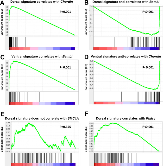 Fig. 4. Gene Set Enrichment Analysis (GSEA) of dorsal and ventral gene signatures. (AâB) The dorsal gene signature (comprised of 107 genes) positively correlated with Chordin (P<0.001), a Spemann organizer marker, and negatively correlated (or anti-correlated) with BAMBI (P<0.001), a marker of ventral tissues. (CâD) The ventral signature (which contains 70 genes) positively correlated with BAMBI (P<0.001), while it negatively correlated with Chordin (P<0.001). (E) SMC1A, used here as a negative control, did not correlate with the dorsal (P=0.355) nor the ventral (not shown) signature. (F) Pkdcc, a novel dorsal gene described here, significantly correlated with the dorsal gene signature (P<0.001). Image published in: Ding Y et al. (2017) Copyright © 2017. Image reproduced with permission of the Publisher, Elsevier B. V. Larger Image Printer Friendly View |