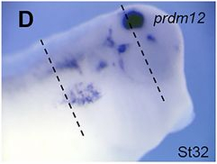 |   | prdm12 (PR domain containing 12) gene expression in Xenopus laevis embryo, assayed via in situ hybridization, NF stage 32, partial lateral view, anterior right, dorsal up. This image is extracted from figure published in: Thélie A et al. (2015), Image published in: Thélie A et al. (2015) Copyright © 2015. Image reproduced with permission of the Publisher and the copyright holder. This is an Open Access article distributed under the terms of the Creative Commons Attribution License.