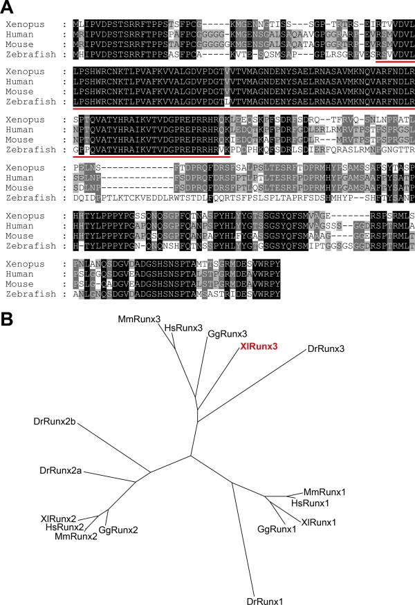 Fig. 1. Sequence and structure comparison of Runx3 proteins across species. (A) The predicted amino acid sequences from Xenopus laevis, human, mouse and zebrafish Runx3 were aligned using ClustalW. Conserved amino acids in all four species or in at least two species are highlighted in black and grey, respectively. The runt domain, signature motif of this class of molecules, is underlined in red. (B) Phylogenetic tree analysis of Runx proteins from Xenopus laevis (Xl), human (Hs), mouse (Mm), chicken (Gg) and zebrafish (Dr). Accession numbers for the source sequences are indicated in materials and methods. Image published in: Park BY and Saint-Jeannet JP (2010) Copyright © 2010. Image reproduced with permission of the Publisher, Elsevier B. V. Larger Image Printer Friendly View |