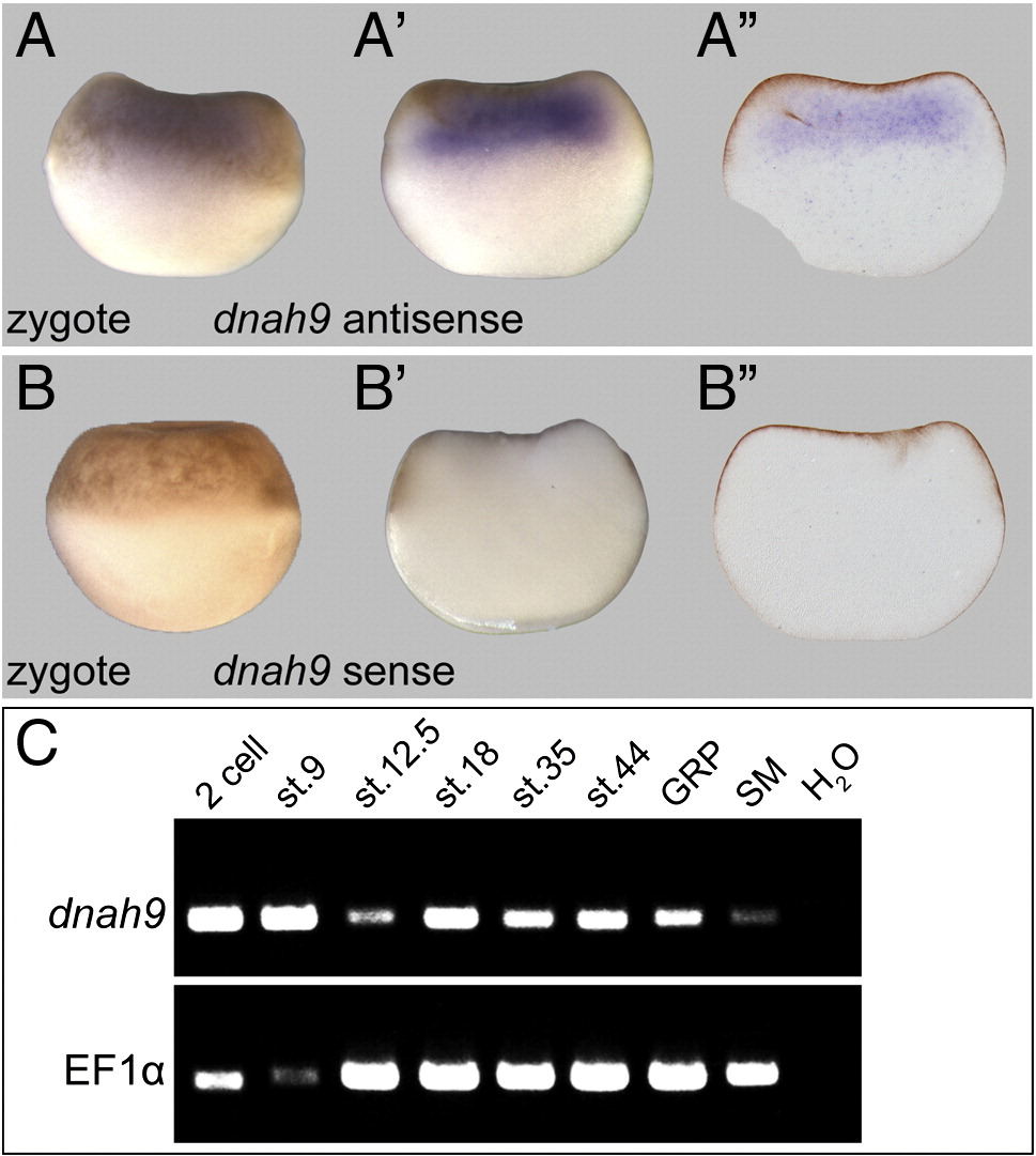 Specificity of early maternal expression patterns of dnah9. (A, B) Whole-mount in situ hybridization of zygotes using antisense (A) and sense (B) probes, shown in whole-mounts (A, B), hemi-sections (Aâ, Bâ) and 30 μm vibratome sections (Aâââ, Bâââ). (C) Semi-quantitative RT-PCR from 2-cell to tadpole stages, and of isolated GRP and SM tissue (top). Elongation factor 1 alpha (bottom) served as control. GRP, gastrocoel roof plate; SM, superficial mesoderm. Note the strong maternal expression of dnah9. Image published in: Vick P et al. (2009) Copyright © 2009. Image reproduced with permission of the Publisher, Elsevier B. V.