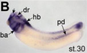 | crabp2 () gene expression in X. during organogenesis. In situ hybridisation of crabp2, dark blue stain indicates expression. Stage 30. This image is extracted from figure published in: Lynch J et al. (2011), Image published in: Lynch J et al. (2011) Copyright © 2011. Image reproduced with permission of the Publisher, Elsevier B. V. Larger Image Printer Friendly View |