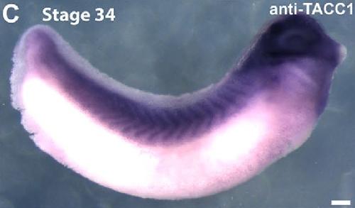 tacc1 (transforming, acidic coiled-coil containing protein 1 ) gene expression in Xenopus laevis embryo, assayed via in situ hybridization, NF stage 34, lateral view, anterior right, dorsal up. This image is extracted from figure published in: Rutherford EL et al. (2016), Image published in: Rutherford EL et al. (2016) © 2016 Rutherford, Carandang, et al. Creative Commons Attribution-NonCommercial-ShareAlike license