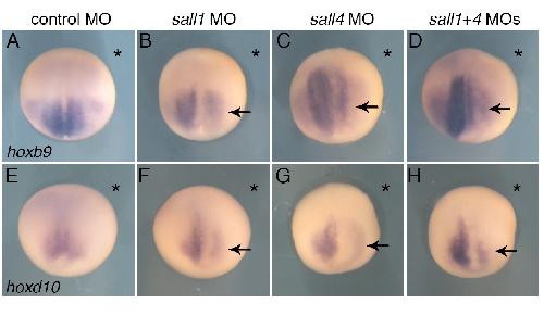 Splice-blocking sall1 and sall4 morpholinos induce partial loss of posterior neural marker gene expression, as assayed by whole-mount RNA in situ hybridization at stage 13 using markers hoxb9 (A-D) and hoxd10 (E-H); dorsal view, anterior up. Splice-blocking sall1 and sall4 morpholinos were injected unilaterally into the embryos shown here. Representative images are shown. Asterisks in images indicate injected side; arrows indicate partial loss of expression. Expression of hoxb9 in sall morphants at later stages is shown in Figure 2 and Supplementary Figure 2.
