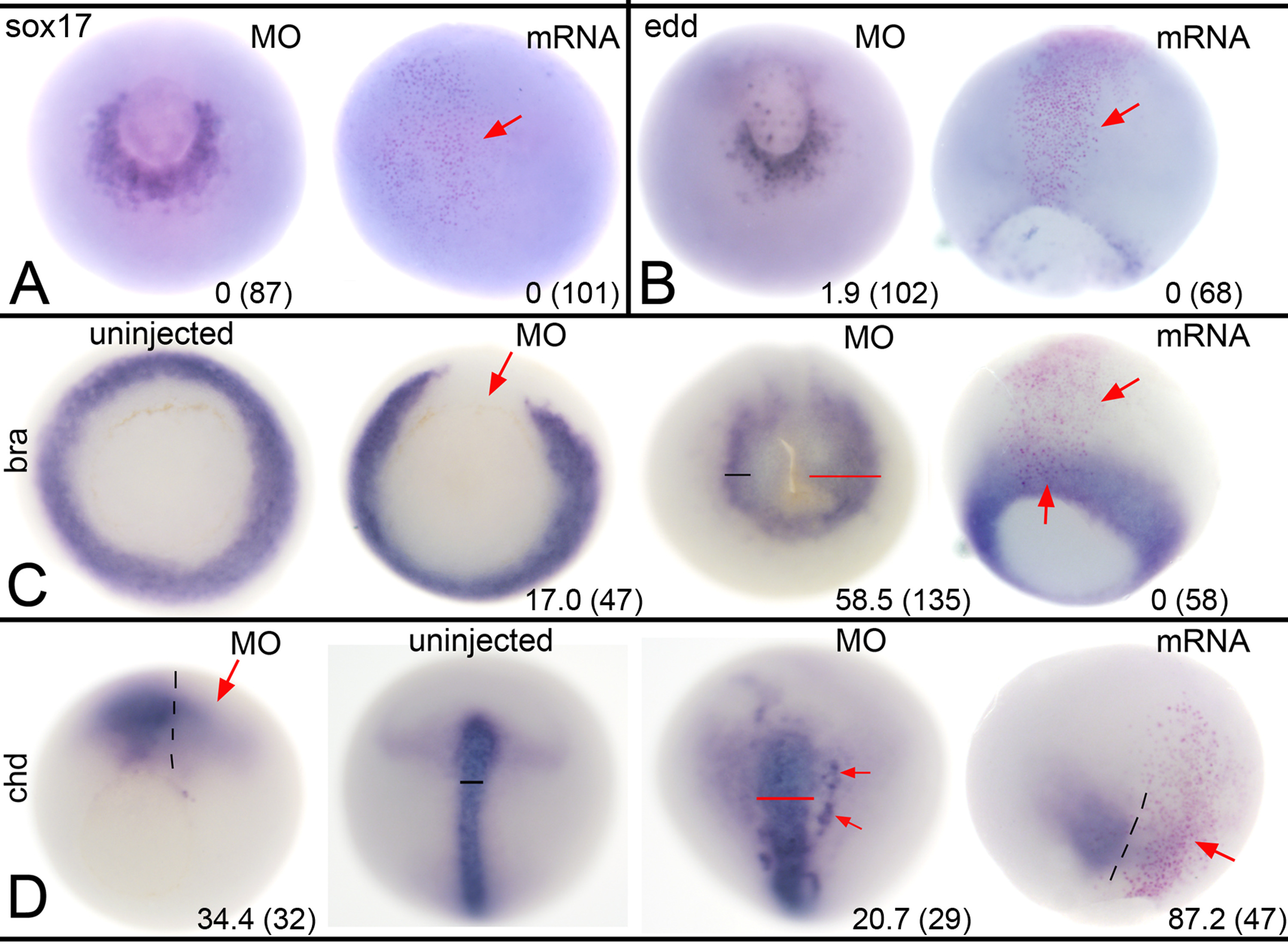 Fig. 4. Altered Wbp2nl levels affect mesoderm but not endoderm. (A) At gastrula stages, sox17 expression surrounding the ventral blastopore on the MO-injected side of an embryo (left image, vegetal view) is not discernably different from control side. Increased Wbp2nl in the animal pole ectoderm (right image, animal view; clone marked by pink nuclei and red arrow) does not ectopically induce sox17. (B) At gastrula stages, edd expression surrounding the ventral blastopore on the MO-injected side (left image, vegetal view) is not discernably different from control side. Increased Wbp2nl in the neural ectoderm (right image, dorsal view; clone marked by pink nuclei and red arrow) does not ectopically induce edd. (C) At gastrula stages, mesoderm expression of bra encircles the blastopore in uninjected control embryos (left image, vegetal view); knock-down of Wbp2nl causes a loss of bra expression (left middle image, vegetal view, red arrow). In contrast, at neural plate stages (right middle image, vegetal view), we detect a posterior expansion (red bar) of bra expression on the knock-down side. At gastrula stages, increased Wbp2nl (right image, dorsal view; clone marked by pink nuclei between red arrows) does not alter endogenous bra expression nor ectopically induce it. (D) At gastrula stages, mesoderm expression of chd is reduced by Wbp2nl knock-down (red arrow, left image, vegetal view; dashed line indicates dorsal midline). In contrast, at neural plate stages, chd is expanded (compare uninjected control pattern [left middle image] to MO-injected pattern [right middle image]; dorsal views with anterior to the top). Red bar shows a wider domain and red arrows denote ectopic expression. At gastrula stages, increased Wbp2nl (right image, dorsal view, anterior to top; dashed line indicates dorsal midline) also reduces endogenous chd expression (red arrow). Frequencies of the phenotypes and sample sizes (n) are given in each panel. Image published in: Marchak A et al. (2017) Copyright © 2017. Image reproduced with permission of the Publisher, Elsevier B. V.
