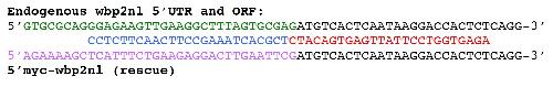 Supplementary material Supplemental Fig. 2: Wbp2nl MO sequences and their alignment to mRNAs. Top: Sequence of the endogenous wbp2nl mRNA including 5′UTR (green) and ORF (black). Translational start site is underlined. Middle: Sequences of the two MOs used in the described studies (MO#1 = blue; MO#2 = red). They are perfectly complementary to the endogenous mRNA. Bottom: wbp2nl ORF is preceded by 6 in-frame copies of the myc epitope sequence. Thus, in the rescue mRNA, the wbp2nl ORF is precede by a long myc sequence (part of which in shown in lavender), the translational start site of which is 350 base pairs upstream of the binding site of MO#2. In addition, MO#1 is not complementary to this mRNA. Thus, the rescue mRNA is resistant to MO-mediated knock-down, as demonstrated in Supplemental Fig. 3. Image published in: Marchak A et al. (2017) Copyright © 2017. Image reproduced with permission of the Publisher, Elsevier B. V. Larger Image Printer Friendly View |