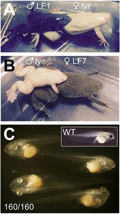 Fig 2. Test crosses between animals carrying tyr-mutated leapfrog transplants and albinos demonstrate germline transmission of mutant alleles. (A) Leapfrog transplant-bearing male (pigmented) is shown amplexed with an albino tyrâ/â female. (B) Leapfrog transplant-bearing female (pigmented) is shown amplexed with an albino tyrâ/â male. (C) Examples of F1 progeny from the cross in A grown to tadpole stage. These tadpoles are albino because they inherited tyr mutant alleles from both F0 parents. Therefore the leapfrog-generated frog carries gametes derived from CRISPR-mutated PGCs. The inset in C shows an unrelated pigmented tadpole at roughly the same stage for comparison. Image published in: Blitz IL et al. (2016) Copyright © 2016. Image reproduced with permission of the Publisher and the copyright holder. This is an Open Access article distributed under the terms of the Creative Commons Attribution License. Larger Image Printer Friendly View |