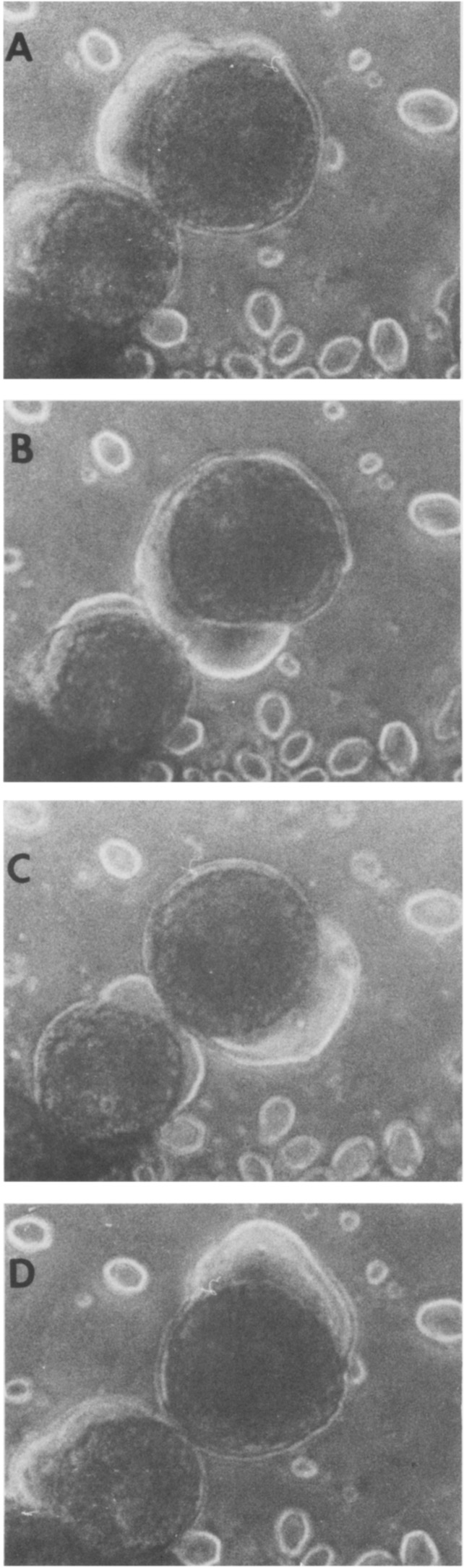 Embryos that had been growing in dissociation media were further disrupted by gentle shaking after cleavage 12. The cells were trans- ferred onto a microscope slide and photographed every 60 set at 160X. The small cytoplasmic bleb on the outer periphery of the cell will normally progress in a single direction around the cell for several revolutions before disappearing and then reappearing. (A) 0 min; (B) 1 min; (C) 2 min; (D) 3 min. At least 70%-80% of the cells defined as motile in Figure 2B exhibit this type of motility pattern. The remaining 20%-30% of motile cells undergo a much slower pseudopodal ex- tension and retraction motility. Final magnification 370X. Image published in: Newport J and Kirschner M (1982) Copyright © 1982. Image reproduced with permission of the Publisher, Elsevier B. V. Larger Image Printer Friendly View |