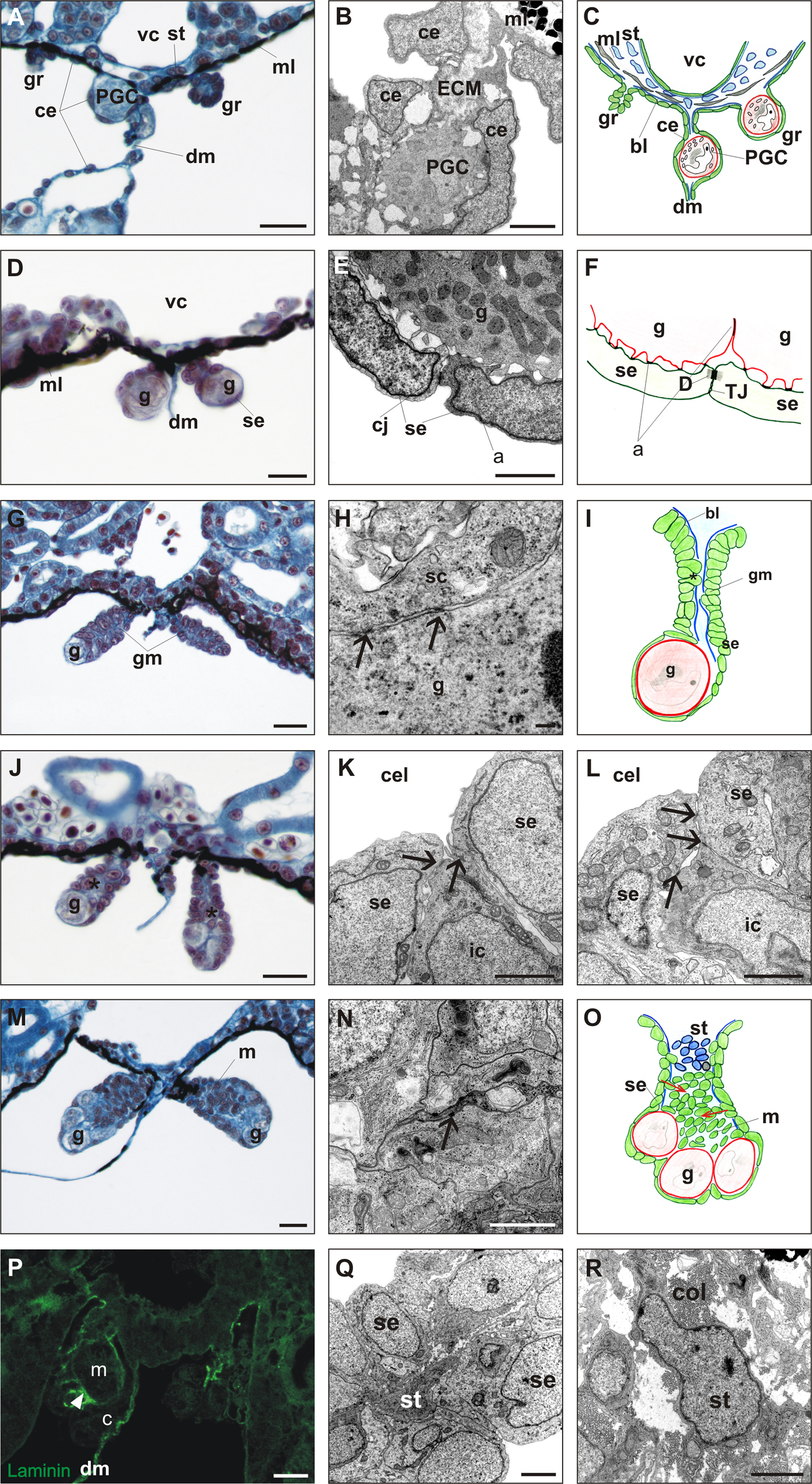 Fig. 1. The structure of undifferentiated gonad in Xenopus laevis. A. The beginning of the formation of genital ridges (gr) located on both sides of the dorsal mesentery (dm), just under vena cava (vc) at NF48. Primordial germ cells (PGC) during migration through dorsal mesentery towards the genital ridges. Stroma (st) and melanophores (mL) fill the space between vena cava and coelomic epithelium (ce). The genital ridges have a form of folded coelomic epithelium. B. Primordial germ cell (PGC) during migration through both sheets of dorsal mesentery formed by coelomic epithelium (ce). PGC adheres to the extracellular matrix (ECM) and coelomic epithelial cells without specialized cell junctions. C. Scheme of the genital ridge (left gr) before PGC settlement, the genital ridge with PGC (right gr), and PGC during migration through dorsal mesentery. Basal lamina (bl, blue line) disappears under coelomic epithelium in the sites of genital ridge formation. D. Undifferentiated gonads at NF49 are composed of flattened coelomic epithelial cells (gonadal surface epithelium, se) that cover germ cells (g). E, F. EM image and diagram of the germ cells adhering to the gonadal surface epithelium (se). Germ cells form microvilli adhering (a) to the somatic cells without specialized cell junctions. Cell junctions (cj) exist between adjacent somatic cells (tight junctions, TJ, and desmosome-like junctions, D). G. Undifferentiated gonads at NF50. Gonadal mesentery (gm) forms a proximal region of the gonad, and the germ cells are located in the distal region. First cells ingressing from the gonadal surface epithelium inwards the gonads are visible (asterisk). H. EM image of adjacent somatic (sc) and germ cell (g) at NF50. Both cells adhere to each other by electron dense points (arrows); basal lamina is absent. I. Diagram of undifferentiated gonads at NF50. The gonad has a form of monolayer epithelium enclosing germ cell (g) in the distal region; basal lamina (bl) is absent in the sites of contact with germ cell and ingressed somatic cells (asterisk). J. Undifferentiated gonads at NF51. Increase of the number of somatic and germ cells, and accumulation of somatic cells in the gonadal center (between both sheets of the gonad mesentery) (asterisk). K, L. EM images of ingression of cells from the gonadal surface epithelium toward the gonad center. Changes in the location of cell junctions are visible. K. Ingressing cell (ic) is the one of the gonadal surface epithelial cells (se); all cells are joined by cell junctions (arrows). L. Two surface epithelial cells (se) joined to each other above the ingressing cell (ic) which losses its connection with coelomic cavity (cel). Cell junctions (arrows). M. Undifferentiated gonads at NF52. In the center of the gonads the medulla forms a mass of somatic cells. Such undifferentiated gonads are composed of the cortex and medulla (m). All germ cells (g) are located exclusively at the periphery and are all joined to the gonadal surface epithelium. N. EM image of medulla cells forming a cluster of tightly packed cells joined by desmosome-like junctions. O. Diagram of undifferentiated gonads at NF52. Arrows indicate direction of cell ingression from the surface epithelium (se). P. Immunofluorescence of laminin reveals deposition of basal lamina (arrowhead) between the cortex (c) and medulla (m) in the undifferentiated gonads at NF52. Q. EM image of stromal cell (st) present between both sheets of surface epithelium in gonadal mesentery at NF52. R. EM image of stromal cell (st) in the undifferentiated gonad at NF53. The stromal cell is surrounded by abundant extracellular matrix containing mainly collagen fibers (col). Scale bars: A,D,G,J,M,P 20 µm; B,E 5 µm; K,L,N,Q,R 2 µm; H 200 nm.