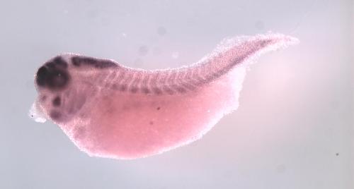 celf2 (CUGBP, Elav-like family member 2) gene expression in X. laevis embryo, assayed via in situ hybridization, NF stage 35 & 36, lateral view, anterior left, dorsal up. Copyright © Perron Lab