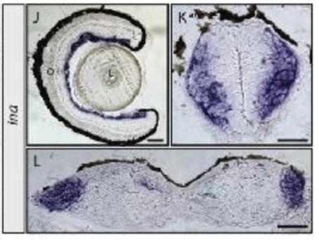 |   | ina (internexin neuronal intermediate filament protein alpha) gene expression in Xenopus laevistdpole, seen in eye (J), brain (L) and spinal cord (K) sections , at NF stage 50. This image is extracted from figure published in: Martinez-De Luna RI et al. (2017), Image published in: Martinez-De Luna RI et al. (2017) Copyright © 2017. Image reproduced with permission of the Publisher, Elsevier B. V.