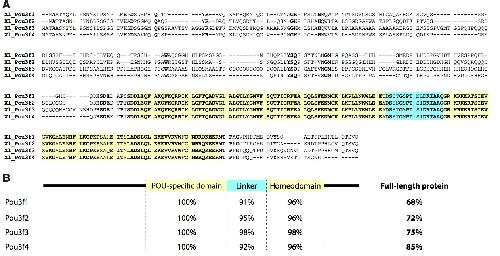 | Fig. 1. Sequence analysis of vertebrate Pou3f proteins. (A) Sequence alignments of the Xenopus laevis (Xl) Pou3f1, Pou3f2, Pou3f3, and Pou3f4