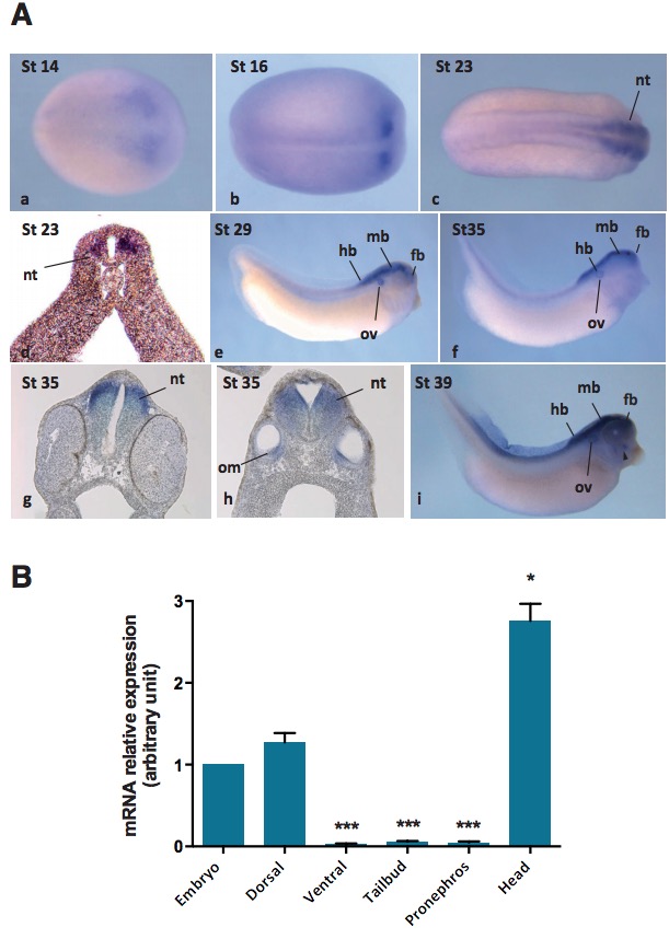 indicated stages of development. Neurula, dorsal view (a,b). Tailbud, dorsal (c) and lateral (e) view. Tadpole, lateral view (f,i). Transverse sections at the