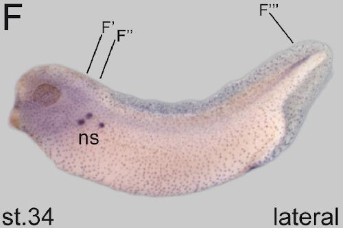 dnah9 (dynein, axonemal, heavy chain 9) gene expression in Xenopus laevis embryo, assayed via in situ hybridization, NF stage 33 & 34, lateral view, anterior left, dorsal up. Image created by: Philipp Vick, Image published in: Vick P et al. (2009) Copyright © 2009. Image reproduced with permission of the Publisher, Elsevier B. V.