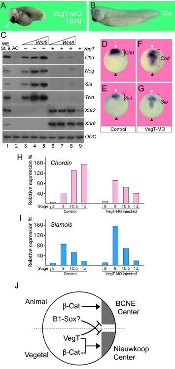 |   | Fig. 7. The BCNE center is restricted to the dorsal-animal region by the maternally localized VegT transcription factor. (A) The phenotype of VegT-MO. White arrowhead indicates enlarged cement gland. (B) Control embryo for (A). (C) RT-PCR analyses of the effects of Wnt8 and VegT mRNA for animal caps. 1, 4, or 16 pg of Wnt8 mRNA and 100 pg of VegT mRNA were injected. (D) Chordin expression in control embryo at stage 9. White and black arrowheads indicate the animal and vegetal poles, respectively. (E) Siamois expression in control embryo. (F) Chordin expression of VegT-MO (16 ng) injected embryo. (G) Siamois expression of VegT-MO injected embryo. Note the expansion of Chordin and Siamois expression towards the vegetal side upon inhibition of VegT. (H) Real-time PCR analyses of Chordin mRNA expression levels from stage 8 to 12. (I) Siamois mRNA expression levels in the same samples. (J) Model of the regulation of the two blastula signaling centers. The border between the BCNE and Nieuwkoop centers is generated by repression by two maternally provided transcription factors: B1-type Sox (animal; Zhang et al., 2004) and VegT (vegetal). Image published in: Ishibashi H et al. (2008) Copyright © 2008. Image reproduced with permission of the Publisher, Elsevier B. V. Larger Image Printer Friendly View |