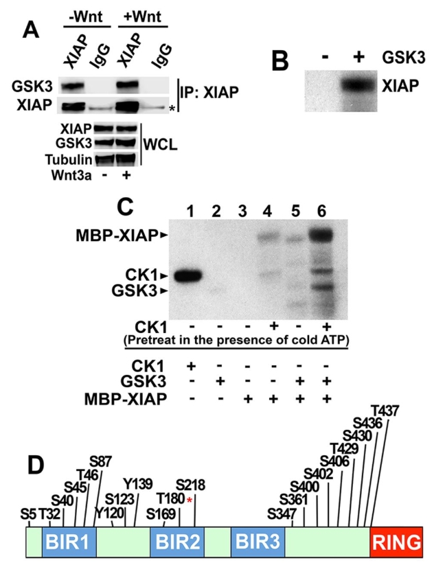 XIAP is phosphorylated by GSK3 at T180. (A) Endogenous XIAP co-immunoprecipitates with endogenous GSK3. XIAP was immunoprecipitated (IP) from whole-cell lysates (WCL) of HEK293STF cells incubated in the absence or presence of recombinant Wnt3a followed by immunoblotting. The asterisk indicates the heavy chain of IgG. (B) Purified XIAP is phosphorylated by GSK3 in vitro in a [γ32P]ATP kinase assay. Reactions were analyzed by SDS/PAGE followed by autoradiography. (C) CK1 enhances XIAP phosphorylation by GSK3. XIAP bound to beads was incubated with CK1 in a kinase reaction containing non-radioactive (cold) ATP (lanes 4 and 6). CK1 was washed away and XIAP-bound beads incubated with GSK3 in a kinase reaction containing [γ32P]ATP. Reactions were analyzed by SDS/PAGE followed by autoradiography. Kinase only lanes show CK1 and GSK3 autophosphorylation (lanes 1 and 2). Results in AâC were replicated at least three times. (D) The predicted phosphorylation site at T180 of XIAP is an in vitro GSK3 phosphorylated site. Predicted phosphorylation sites on XIAP were curated by the PhosphoSitePlus online resource tool (Hornbeck et al., 2015). LC-MS analysis of XIAP identifies T180 (asterisk) as a prominent in vitro GSK3 phosphorylation site. Image published in: Ng VH et al. (2018) Copyright © 2018. Image reproduced with permission of the Publisher, The Company of Biologists Ltd. Larger Image Printer Friendly View |
