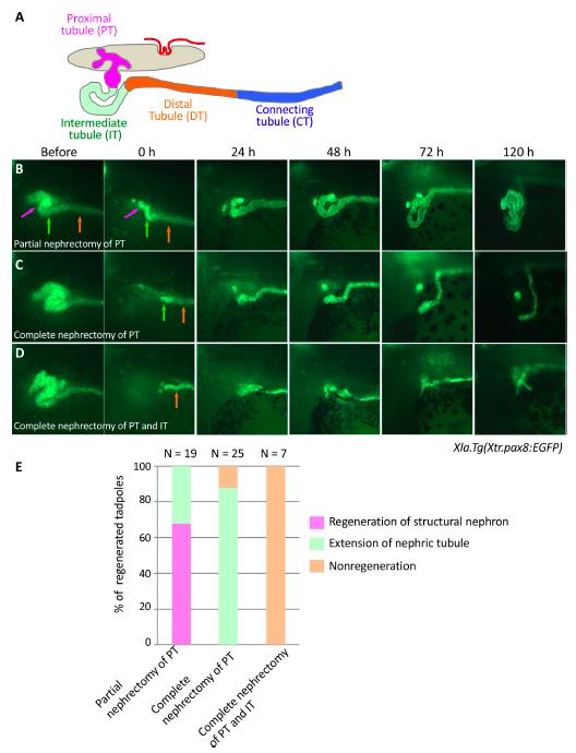 Figure 1. A) A schematic image of X. laevis nephron. PT: proximal tubule; IT: intermediate tubule; DT: distal tubule; CT: connecting tubule. Magenta arrows: PT; green arrows: IT; orange arrows: DT. (B) Representative regeneration pattern of partially resected proximal tubules. Proximal tubules regenerate a coiled structure. (C) Regeneration pattern of completely resected proximal tubules. The remaining intermediate tubules extend, but no coiled structure is regenerated. (D) Regeneration pattern of completely resected intermediate tubules. No extension of tubules is observed. (E) Statistics of the regeneration pattern. The statistics of three independent experiments are summarized. Image published in: Suzuki N et al. (2019) © 2019, Suzuki et al. Creative Commons Attribution license Larger Image Printer Friendly View |