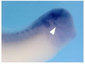 ntrk3 (neurotrophic receptor tyrosine kinase 3) gene expression in Xenopus laevis embryo, assayed via in situ hybridization, NF stage 28, lateral view, anterior right, dorsal up. This image is extracted from figure published in: Desiderio S et al. (2019), Image published in: Desiderio S et al. (2019) Copyright © 2019. Image reproduced with permission of the Publisher and the copyright holder. This is an Open Access article distributed under the terms of the Creative Commons Attribution License.