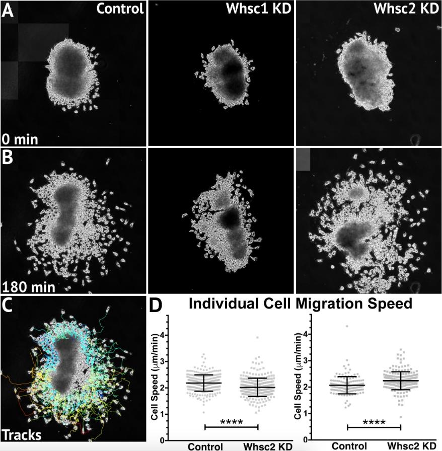 |   | FIGURE 6. Whsc1 manipulation alters CNC migration speeds in vitro. Dissected CNC explants from control, Whsc1 KD, or Whsc2 KD embryos were plated on fibronectin-coated coverslips, allowed to adhere and begin migration, and imaged for 3 h using 20à phase microscopy. (A) Representative explants at initial timepoint (0 min). (B) Explants after 3 h migration time. (C) Representative tracks generated by FiJi Trackmate plug-in. (D) Mean track speeds of Whsc1 or Whsc2 KD explants compared to their controls. (Explants quantified: 3â4 explants from control and KD embryos were plated for each experiment, explants with neural or epithelial contaminant were excluded from analysis. Three separate experiments were performed for each depletion. Whsc1 controls: 272 cells, 9 explants. Whsc1 KD: 282 cells, 9 explants. Whsc2 controls: 151 cells, 12 explants. Whsc2 KD: 195 cells, 8 explants.) ââââP < 0.0001, n.s., not significant. Scalebar is 250μm. Image published in: Mills A et al. (2019) Copyright © 2019 Mills, Bearce, Cella, Kim, Selig, Lee and Lowery. Creative Commons Attribution license