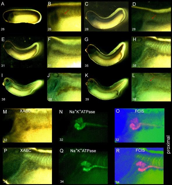 |   | Fig. 6. Pronephric expression of an ABC transporter. Embryo stages are shown on the lower left of each panel. XABC expression in the pronephros is first detected at stage 26 (A and B), red arrow. The XABC1 gene is expressed in both early and late proximal segments (AâL). Other expressing tissues include the somites, brachial arches, and head. By stage 35, expression of XABC in nonpronephric tissues increases, necessitating shorter development times, hence the relatively weak signal in later panels. Panels MâR illustrates FCIS staining. Purple development of the transporter is shown in the left column, FITC-tyramide development of the Na+K+ATPase counterstain shown in the middle, and FCIS overlay shown on the right. Image published in: Zhou X and Vize PD (2004) Copyright © 2004. Image reproduced with permission of the Publisher, Elsevier B. V.