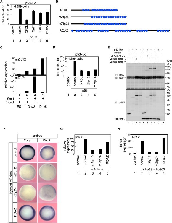 Figure 7. XFDL-Related Zn-Finger Proteins Antagonize p53 Activity(A) Luciferase assay using mammalian H-1299 cells. Cells were harvested 24 hr after transfection with p53-luc, phRL-null, and the indicated expression plasmids.(B) Domain structure of mZfp12 and mZfp74 and ROAZ. Blue filled circles: Zn-finger motifs. In mZfp12 and mZfp74, the amino-terminal regions contain a Krüppel-associated box, which is missing in XFDL.(C) q-PCR analysis for the expression of mZfp12 and mZfp74. Undifferentiated mouse ES cells (lane 1) and differentiating ES cells (cultured by the SFEB method; Watanabe et al., 2005), E-cadherin+/Sox1â cells (uncommitted or non-neural), and E-cadherinâ/Sox1+ cells (neural) were collected by FACS and analyzed by q-PCR (normalized by β-actin expression).(D) Luciferase assay in H-1299 cells. Cells were transfected with p53-luc and the indicated expression plasmids.(E) Coimmunoprecipitation analysis of mammalian XFDL-related proteins (Venus-fused) and hp53 (HA-tagged) using HEK293 cells. Asterisks: nonspecific bands.(FâH) Activities of mammalian XFDL-related genes in Xenopus. (F) Control (top row), mZfp12 (second row), mZfp74 (third row), or ROAZ (bottom row) mRNA (400 pg/cell each) was injected into Xenopus and analyzed as in Figures 2D and 2F. Vegetal view. (G) q-PCR analysis for Mix.2 expression. Xenopus embryos were injected with the indicated mRNAs (400 pg/cell each) and animal caps were analyzed as in Figure 2A. (H) q-PCR analysis for Mix.2 expression in the animal cap. mRNAs of mammalian XFDL-related genes were coinjected with hp53 (50 pg/cell) and hp300 (200 pg/cell) (lanes 2â5). Analysis was performed as in Figure 4G. Image published in: Sasai N et al. (2008) Copyright © 2008. Image reproduced with permission of the Publisher, Elsevier B. V.