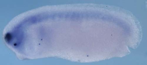 eomes (eomesodermin) gene expression in Xenopus tropicalis embryo, NF stage 28 assayed by in situ hybridization, lateral view, anterior left dorsal up. Copyright © Harland Lab