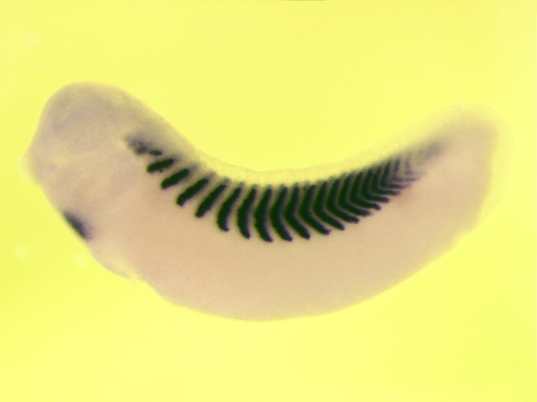 mybc3 (myosin binding protein C3) gene expression in X. laevis embryo, NF stage 28, assayed via in situ hybridization, lateral view, anterior left, dorsal up. Copyright © CNRS UMR 8080, Nicolas Pollet, , 2005 This image is extracted from figure published in: Pollet N et al. (2005), Image published in: AXELDB Database, AxelDB (Image Pages) Copyright © 2005. Image reproduced with permission of the Publisher, Elsevier B. V.