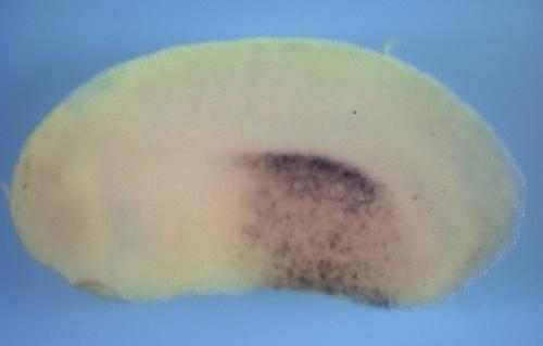 wnt8a (wingless-type MMTV integration site family, member 8A) expressed in Xenopus laevis embryo via in situ hybridization, NF stage 22, lateral view, anterior left.