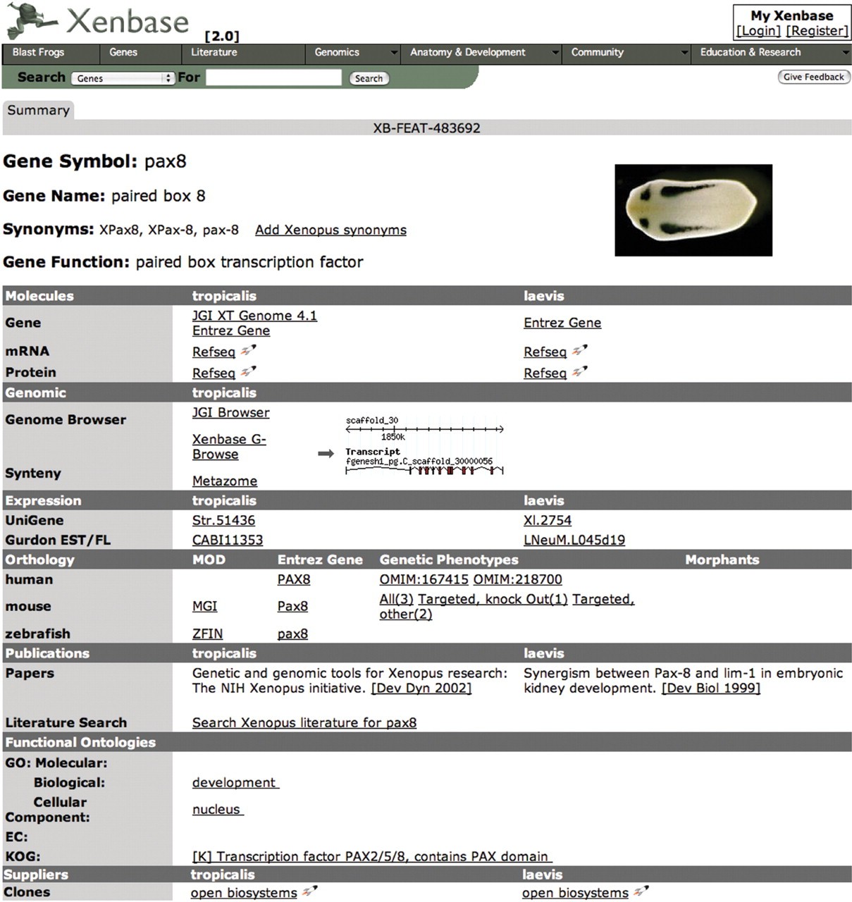 Figure 1. Xenbase gene page screenshot. A screenshot of the display generated by a search for ‘pax8’. Xenopus tropicalis is arranged on the left when species-specific data is displayed and X. laevis-specific data in the right column. Data common to the both species is not restricted to this format and is presented throughout the corresponding row. Image published in: Bowes JB et al. (2008) © 2007 The Author(s). Creative Commons Attribution-NonCommercial license Larger Image Printer Friendly View |