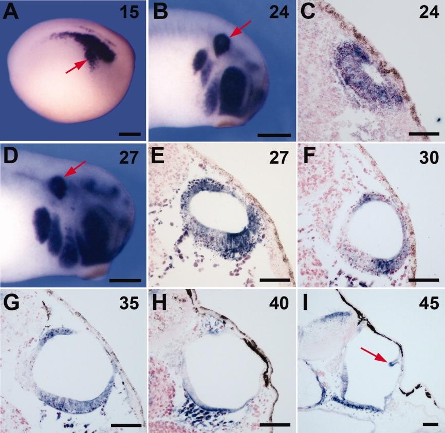 Figure 5. Sox9 is expressed throughout the otic vesicle and in the developing semicircular canals. Developmental expression of Sox9 in the otocyst of wild type embryos by whole-mount in situ hybridization (A,B,D) and by in situ hybridization on section (C,E-I). The embryonic stage (Nieuwkoop and Faber,[1967]) is indicated in the upper right corner of each panel. A-H: Sox9 is initially expressed throughout the entire otic epithelium (A-C) and then become progressively restricted to the dorsal and ventral aspects of the otic vesicle (D-H). I: At stage 45, Sox9 is also detected in the protrusions of the developing semicircular canals (arrow). In all panels, dorsal to top. For whole embryos staining anterior is to the right. Scale bars = 300 mu m in A,B,D; 50 mu m in C,E.I. Image published in: Park BY and Saint-Jeannet JP (2010) Copyright © 2010. Image reproduced with permission of the Publisher, John Wiley & Sons.