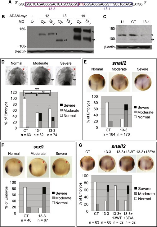 |   | Figure 1. The Metalloproteinase Activity of ADAM13 Is Required for Xenopus CNC Induction(A) cDNA sequence of adam13 showing the translation start site (red) and targets of MOs 13-1 and 13-3.(B) One blastomere of two-cell stage embryos was injected with MO 13-1 (6 ng) and transcripts encoding myc-tagged ADAMs (ADAM12 or 13: 200 pg; ADAM19: 100 pg). Embryos were cultured for 20 hr and western blot of whole-embryo lysates carried out using an anti-myc antibody.(C) Western blot of stage 11â12 embryo lysates showing KD of endogenous ADAM13 by injection of MO 13-1 at one-cell stage (12 ng MO/embryo; 20 embryos/lane).(D) Head cartilage phenotypes of ADAM13 KD. One anterior-dorsal blastomere of eight-cell stage embryos was injected with the indicated MO (1.5 ng). Embryos were allowed to develop to stage 46 and scored for head cartilage defects. Images were gray-scale inverted for easier visualization of head cartilage. One example of each phenotype is shown in the upper panels, and results of three independent experiments are graphed in the lower panel (error bars represent SDs). *p = 0.03; **p = 0.005; NS, not significant (p = 0.43). See Figure S1D and Experimental Procedures for details on phenotype scoring and statistics.(E and F) Four-cell stage embryos were injected in one anterior-dorsal blastomere with 3 ng MO 13-3, allowed to develop to stage 12.5/13, and then processed by in situ hybridization for snail2 (E) or sox9 (F).(G) Embryos were injected with the indicated MO (3 ng) and ârescueâ transcripts (100 pg each), and in situ hybridization performed as in (E). Red asterisks in (D)â(G) denote injected side.Single and double arrowheads in (B) and (C) point to the pro- and mature forms of ADAMs, respectively, and arrows in (D) point to impaired head cartilage structures as compared with the uninjected side. U, uninjected; CT, control MO; n, number of embryos scored (same below). Image published in: Wei S et al. (2010) Copyright © 2010. Image reproduced with permission of the Publisher, Elsevier B. V.